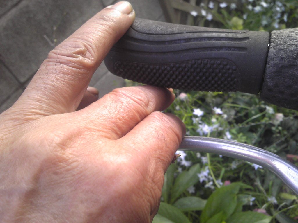 ブレーキをしっかり掛けた時、ハンドルとブレーキレバーの間に指1本半ぐらいの余裕があるように調整します。