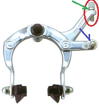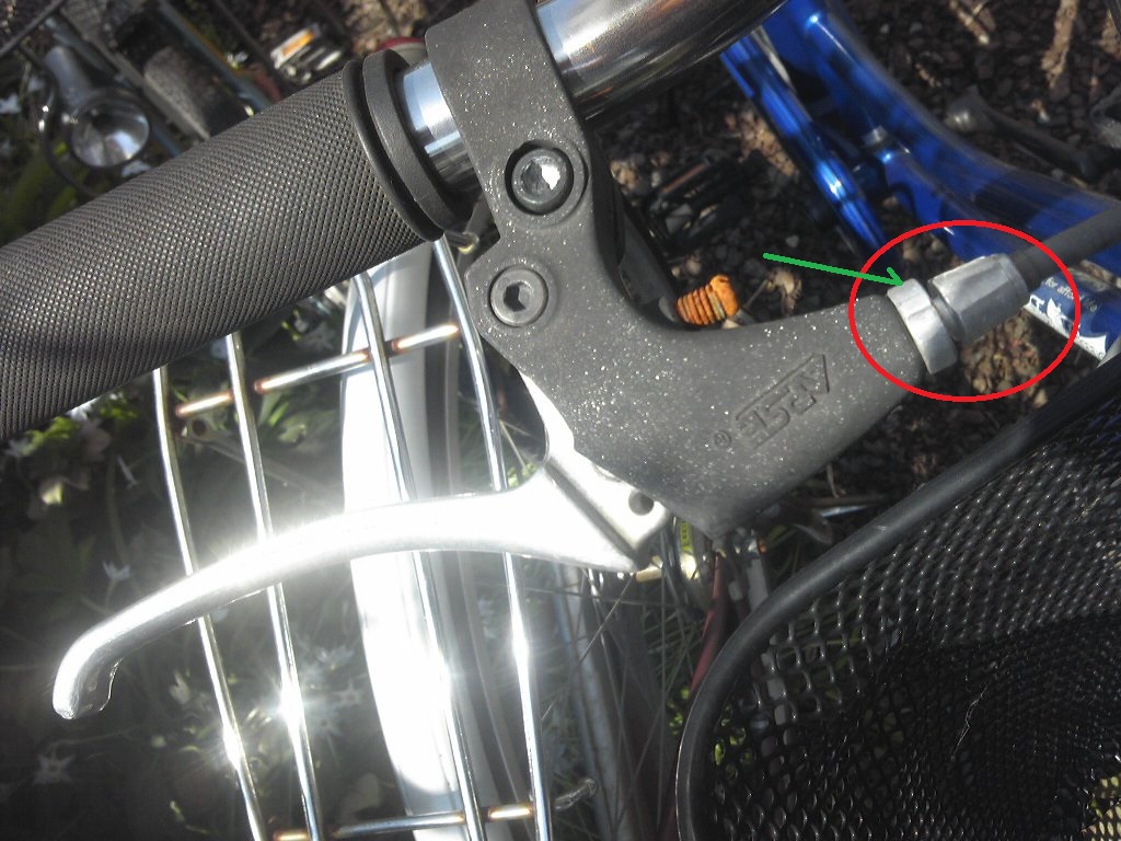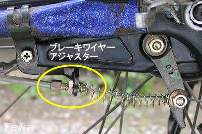 赤丸のネジを反時計方向に回すと、ワイヤーが張って、ブレーキレバーを握りこまなくてもブレーキが効くようになります。